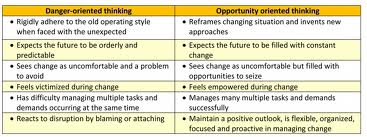 Resilient leaders also opportunity-oriented. They expect change, reframe new situations or invent new approachs, see change as opportunities to seize, and feel empowered by change. In contrast, “danger-oriented” leaders rigidly adhere to old operating styles, and feel victimized during change, among other non-resilient traits.